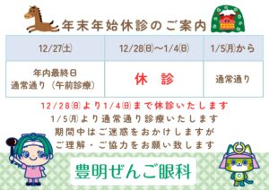 12月28日(日)より1月4日(日)まで休診いたします 。 年末の診療の最終日は12月27日(土)となります。 年始は1月5日(月)より通常通り診療いたします。 期間中はご迷惑をおかけしますが、ご理解・ご協力をお願い致します。